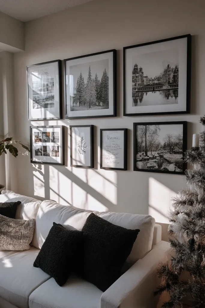 This living room feels calm, chic, and perfectly balanced in black and white. The white sofa layered with textured pillows sits beneath a beautiful gallery wall of black-framed prints, featuring winter landscapes and simple sketches that echo the season without feeling overly themed. Natural sunlight casts soft shadows across the wall, adding warmth to the cool palette. A frosted Christmas tree peeks from the side, its shimmer blending seamlessly into the neutral tones of the space.
