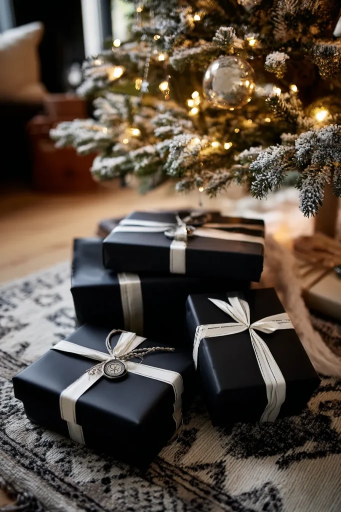 These beautifully wrapped gifts prove that black can look just as festive as red or green. Matte black wrapping paper tied with crisp white ribbons creates a sleek, modern look that stands out beneath the softly lit Christmas tree. The presents rest on a textured patterned rug, adding warmth and contrast to the cool tones above. Soft golden fairy lights reflect off the snow-dusted branches, giving the whole scene a cozy glow that feels elegant and inviting.