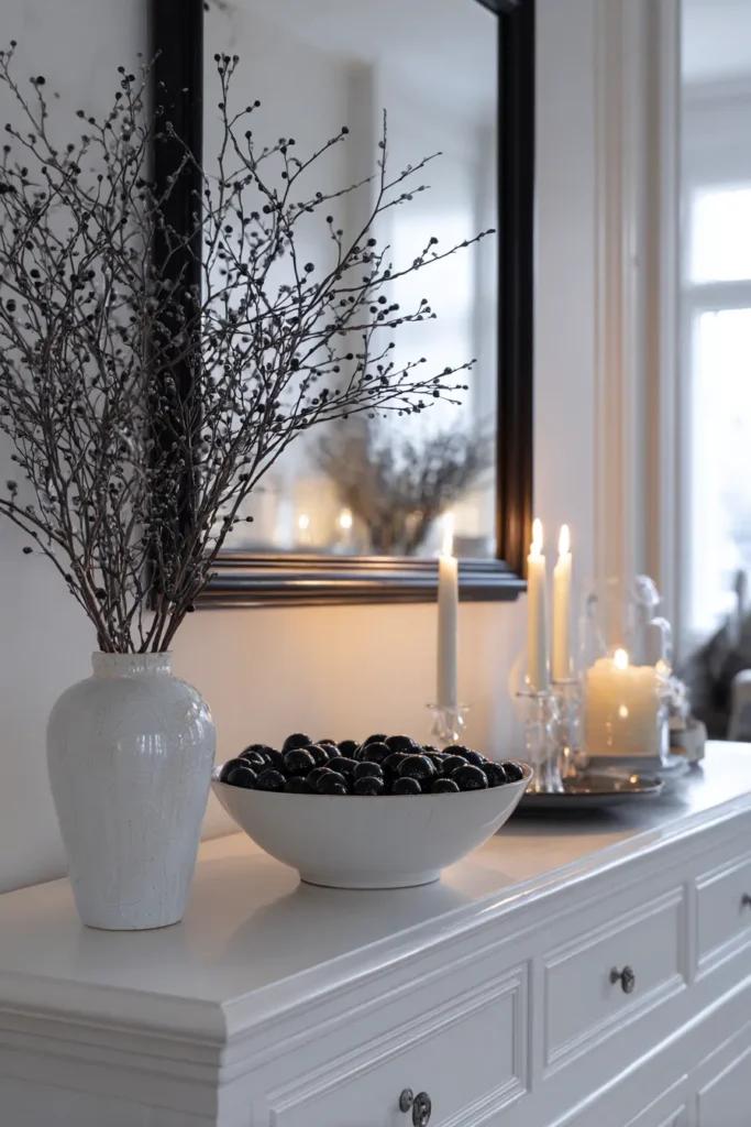 This elegant white sideboard captures the essence of minimal Christmas charm. A large mirror framed in black reflects the glow of flickering candles, creating a warm, inviting light. A simple white vase filled with frosted branches adds height and texture, while a bowl of glossy black ornaments brings in that perfect touch of contrast. Every piece feels intentional, from the soft curves of the ceramics to the sleek simplicity of the candleholders.