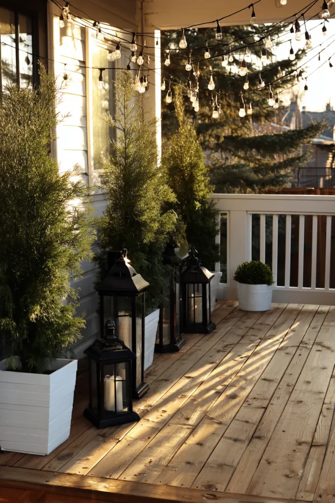 This cozy porch feels festive in the most natural way. Rows of black lanterns with white candles line the wooden deck, paired with lush evergreen trees in crisp white planters. Overhead, strands of string lights drape softly across the space, adding a gentle golden glow that makes the whole area feel magical at sunset. The mix of textures from the greenery, wood, and metal creates a perfectly balanced look that feels modern yet inviting.