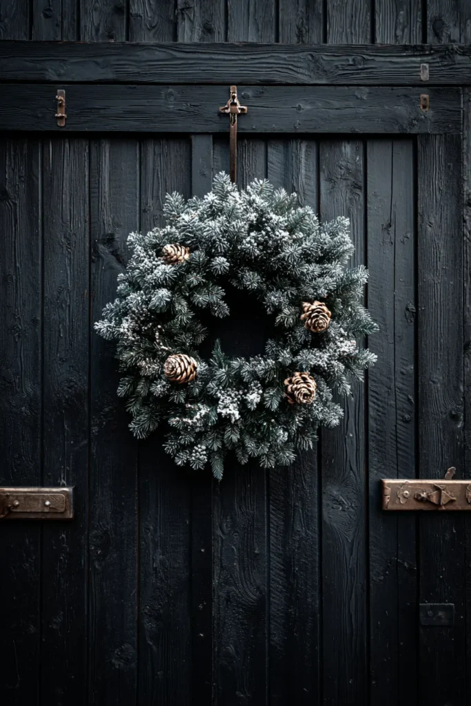 This simple yet striking design feels like a scene straight out of a cozy winter movie. A lush green wreath dusted with snow hangs perfectly against a black wooden barn door, creating a gorgeous contrast that instantly catches the eye. The pinecones tucked within the wreath add a touch of rustic texture, while the frosted greenery keeps the whole look feeling fresh and seasonal. The dark backdrop makes the wreath’s soft whites and greens pop beautifully, proving that minimal color can still make a bold statement.
