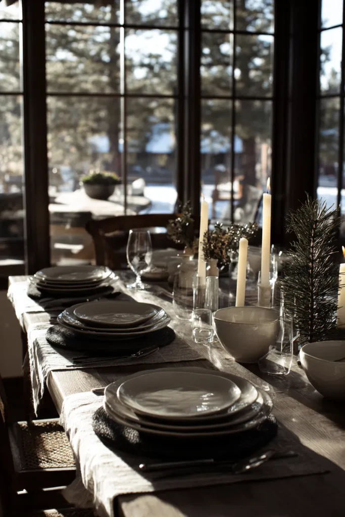 This dining setup feels like understated Christmas elegance at its best. The soft glow of taper candles creates a warm, intimate atmosphere, while simple white dinnerware rests on black woven chargers for that perfect contrast. Natural linen runners add a touch of rustic texture, and small pine branches tucked into clear glass vases bring in a hint of festive greenery. The large windows let in the golden afternoon light, giving the entire space a cozy, natural glow.