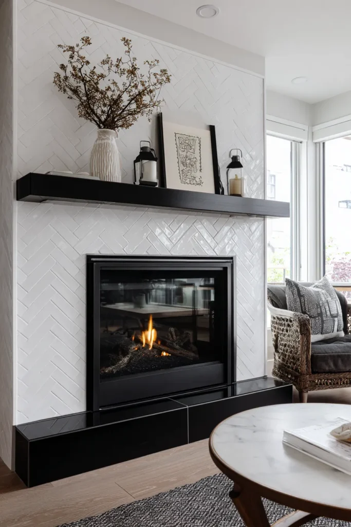 This fireplace setup nails that perfect modern minimal look. The glossy white herringbone tile gives the space a sleek backdrop, while the matte black mantel and fireplace frame add depth and definition. A few simple decor accents like lanterns, a neutral art print, and a tall ceramic vase with winter branches keep the look festive but refined. The natural textures in the woven chair and cozy pillows soften the sharp contrast, making the room feel warm and balanced.