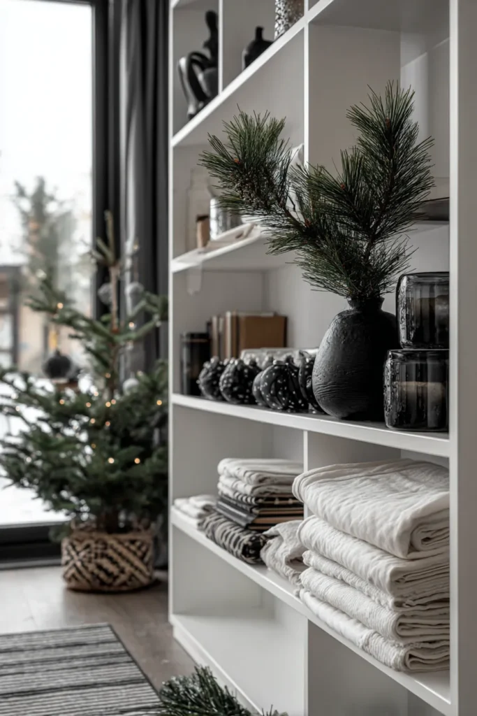 This elegant shelving display shows how Christmas decor can blend seamlessly into modern everyday styling. The crisp white shelves create a clean backdrop for the mix of folded linens, textured black vases, and glossy black ornaments. A few sprigs of pine add a fresh, festive touch without overpowering the minimalist aesthetic. In the background, a small Christmas tree in a woven basket ties everything together, keeping the palette natural and sophisticated.