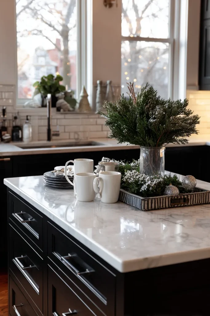 This kitchen proves that holiday charm can feel fresh and sophisticated. The black cabinetry grounds the space beautifully while the white marble countertop adds a luxurious touch. A simple tray centerpiece with evergreen branches, tiny white blooms, and silver ornaments adds just enough Christmas cheer without feeling overdone. The soft light streaming through the windows gives the whole room a cozy glow, making it the perfect place to gather with coffee mugs in hand.