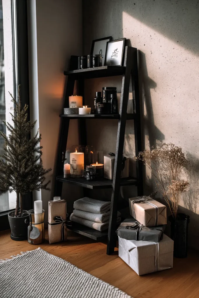 This modern corner setup feels like a quiet winter retreat. A black ladder shelf leans casually against a concrete wall, dressed with candles in various shapes and sizes, neatly folded blankets, and a few wrapped gifts that double as decor. The tiny evergreen tree adds a natural touch, balancing the sleek black accents with a hint of softness. The warm glow from the candles reflects off the smooth wall, creating an inviting and calming atmosphere that feels both festive and grounded.