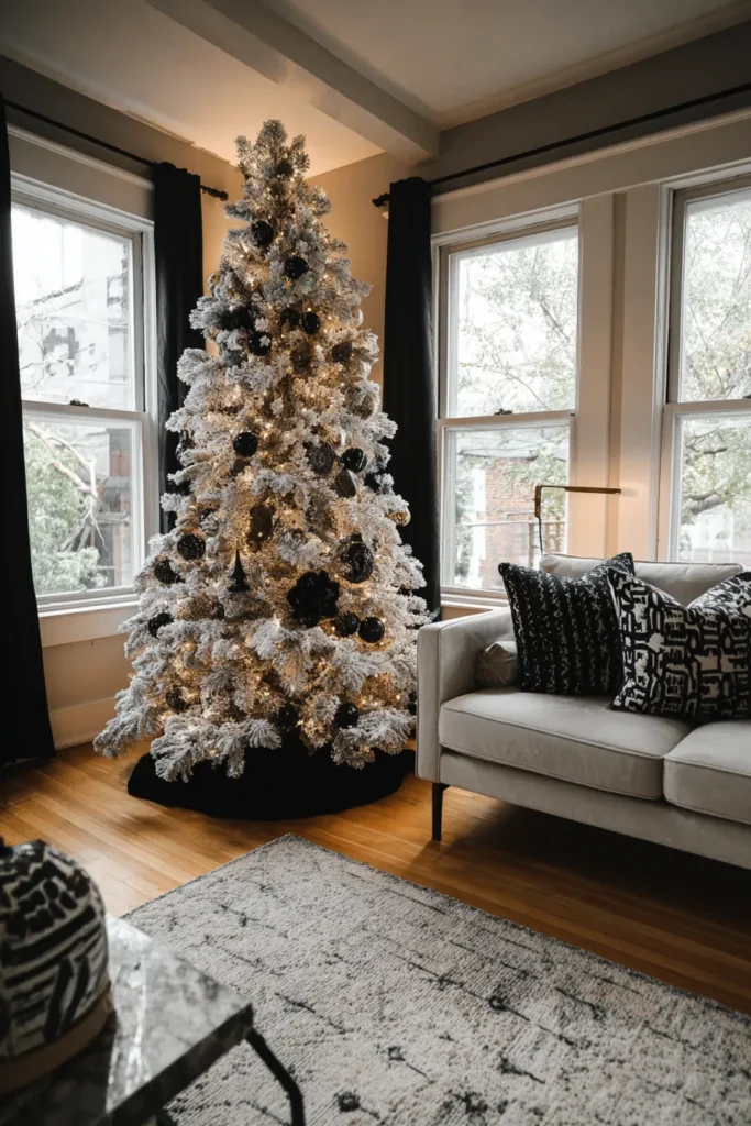 This living room captures the beauty of contrast perfectly. The tall snow flocked Christmas tree glows with soft golden lights, its branches dotted with bold black ornaments that make every shimmer stand out. The surrounding decor ties in flawlessly, with black and white patterned pillows, dark curtains, and a neutral sofa that lets the tree take center stage. The cozy mix of textures from the soft rug to the velvety cushions gives the space an inviting warmth that feels modern yet timeless.
