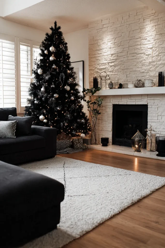 This living room design turns tradition on its head with a bold black Christmas tree dressed in silver ornaments and warm twinkling lights. The tree stands tall beside a textured white stone fireplace, creating a striking yet balanced contrast. The dark sectional sofa and cozy white rug continue the black and white palette, while touches of greenery and candlelight keep the space feeling warm and inviting. Everything feels intentional, elegant, and just a little bit daring.