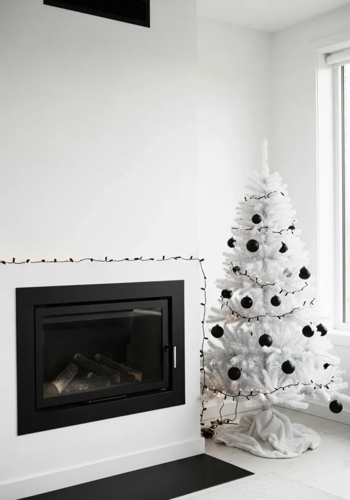 This cozy space keeps things sleek and balanced with a white Christmas tree decorated in matte black ornaments. The black fireplace creates a stunning visual anchor against the crisp white walls, tying the monochrome palette together beautifully. Twinkling string lights wrap the tree and extend toward the fireplace, adding a touch of warmth without interrupting the clean lines.