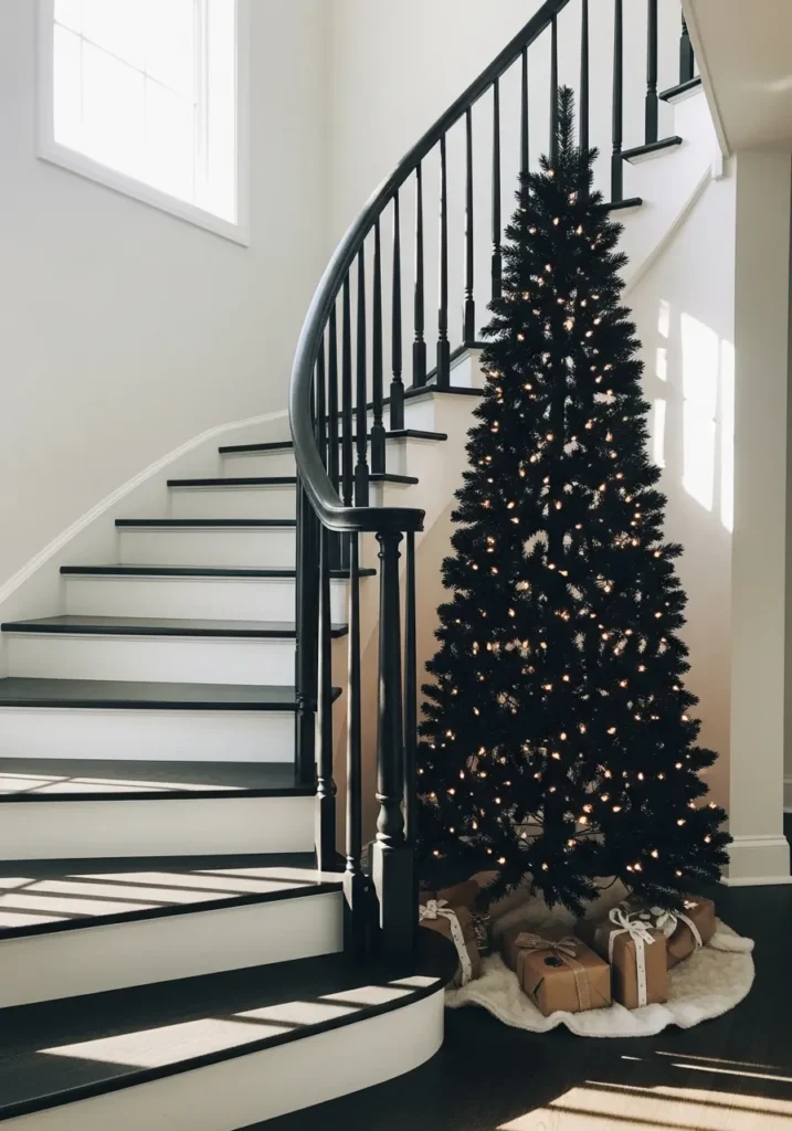 Placed beside a curved staircase, this black Christmas tree stands tall and refined. The warm string lights add a soft glow that complements the black and white steps beautifully. Brown paper presents tied with white ribbons complete the look, keeping everything coordinated and natural.