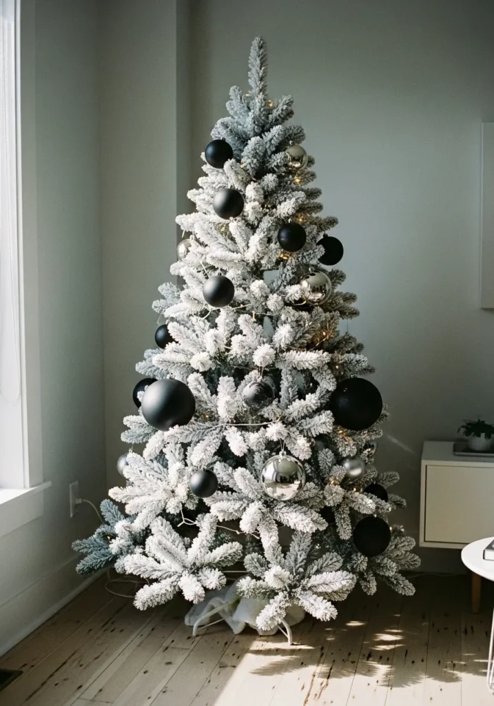 This frosted tree with matte black and silver ornaments feels like a winter dream. The layers of soft white snow-dusted branches shimmer in the light, while the bold ornaments create a stunning modern edge. The neutral background lets the tree take center stage effortlessly.