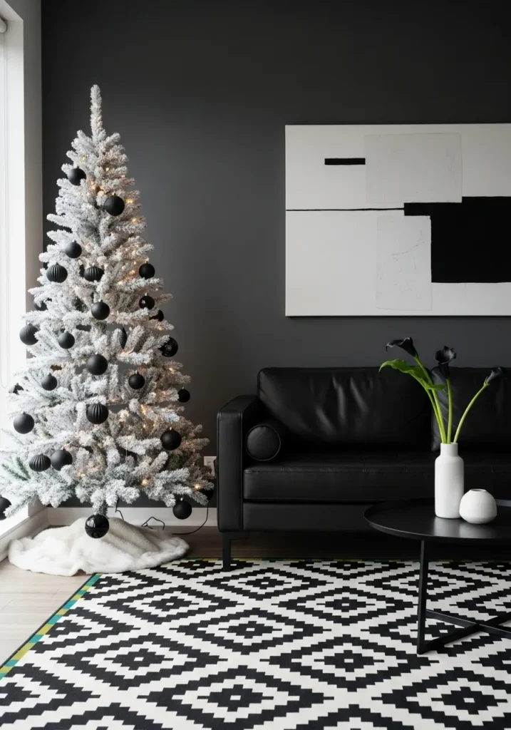 This living room feels like a black-and-white masterpiece. A frosted Christmas tree with black ornaments pairs perfectly with the dark wall, black leather sofa, and geometric rug. The sleek furniture and minimalist art tie the look together in perfect harmony.