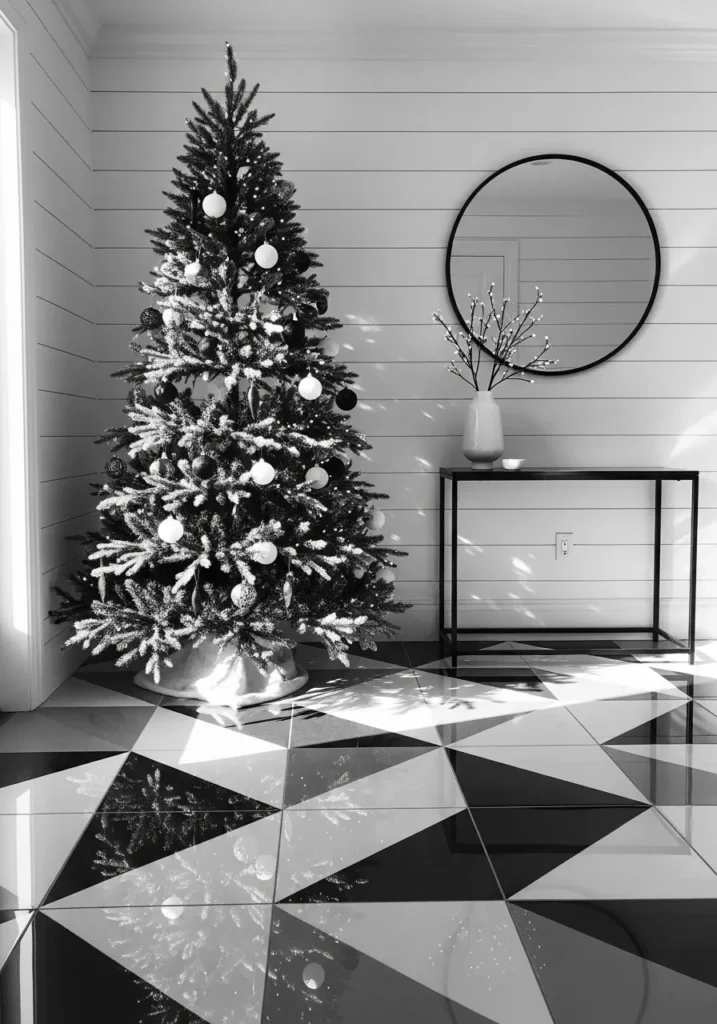 This modern entryway feels effortlessly elegant with its snowy Christmas tree and sleek geometric floor tiles. The tree, decorated with black and white ornaments, stands tall against crisp shiplap walls, while the round mirror and minimal console table add balance to the space. Natural light dances across the glossy floor, creating a stunning reflection that feels both festive and refined.
