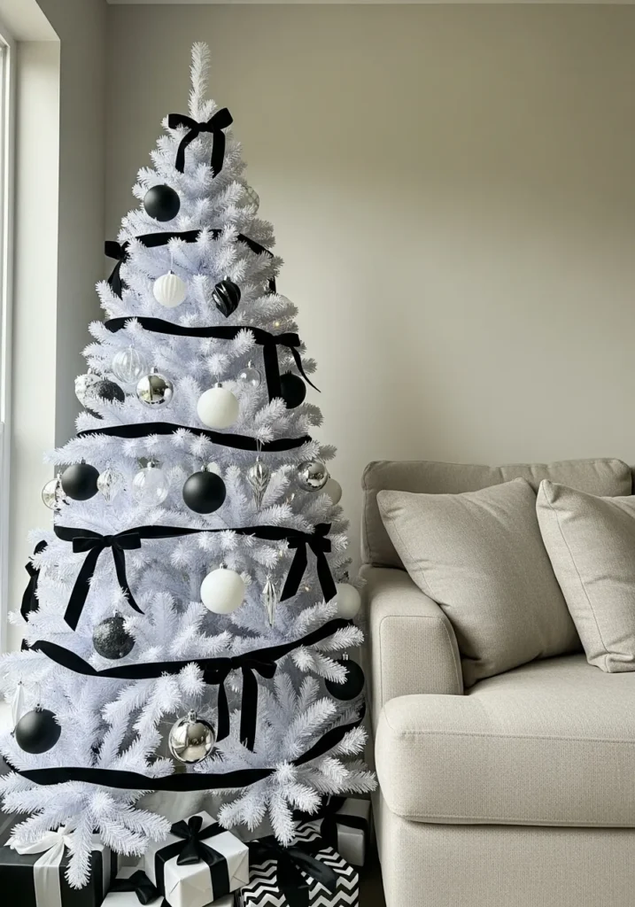 Here’s a bold take on modern elegance—a white Christmas tree decorated with black ribbons and monochrome ornaments. The gift boxes beneath it are wrapped to match, creating a perfectly coordinated look that still feels cozy beside the soft neutral sofa. It’s festive yet fashion-forward in all the right ways.