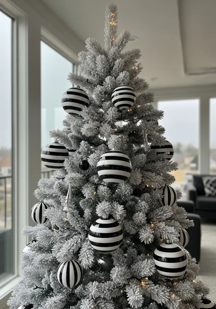 This frosted Christmas tree makes a graphic statement with large black-and-white striped ornaments that pop against the snowy branches. The overall look is modern and playful, bringing just the right amount of personality into a sleek living room setting.