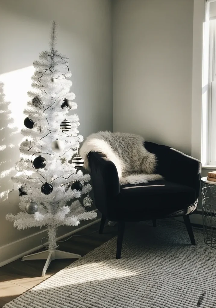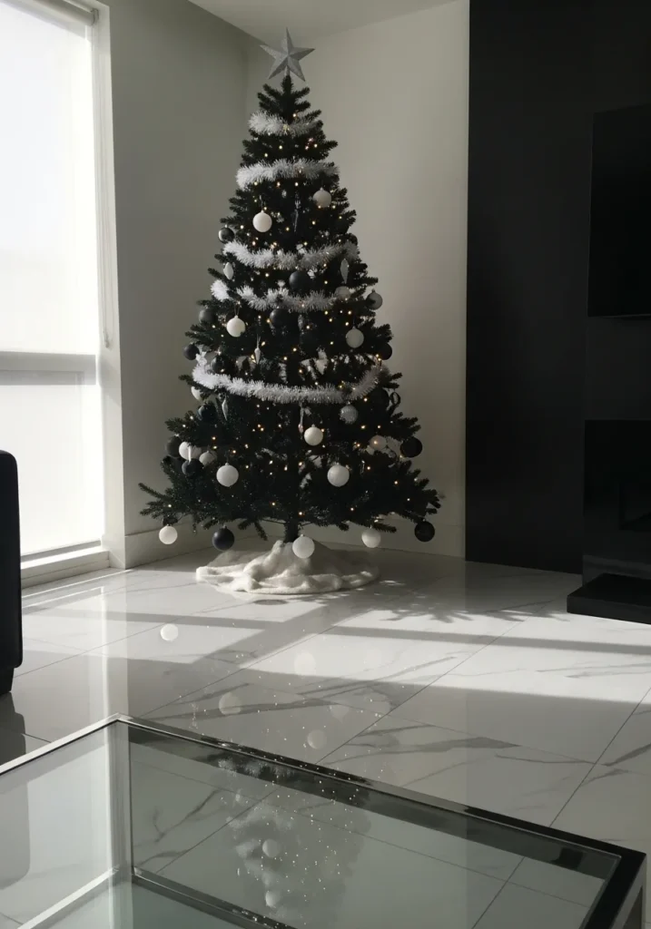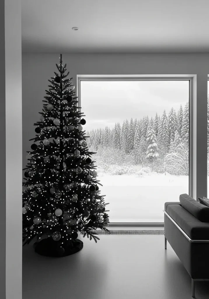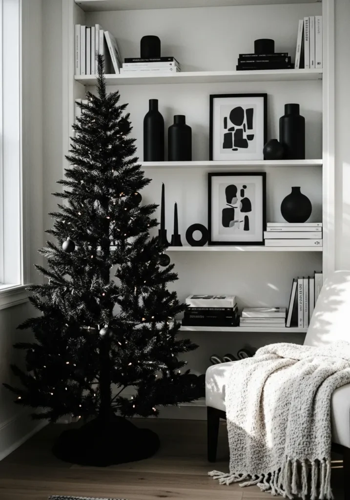 I find this design incredibly stylish because it feels both bold and sophisticated. The monochrome look is edgy without being cold, and that soft light streaming in makes it feel so cozy. It’s the perfect setup for someone who wants their holiday decor to look like it belongs in a design magazine.