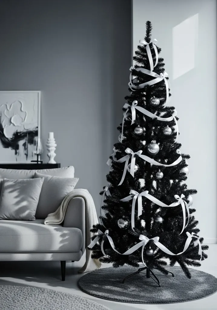 Here, a black Christmas tree wrapped in wide white ribbons takes center stage in a sophisticated, monochrome living room. The silver baubles and soft gray tones of the surrounding decor give everything a cohesive, high-end feel. Subtle lighting and minimal furniture keep the focus right where it belongs—on that striking tree.