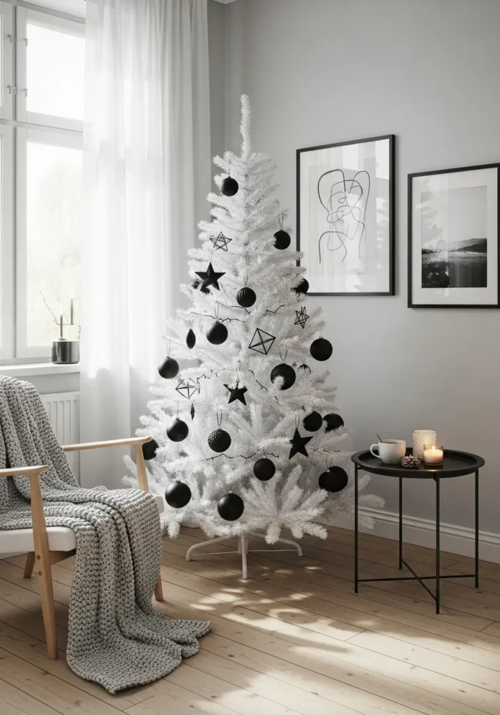 This airy room blends Scandinavian minimalism with modern Christmas charm. The white tree decorated with black ornaments, stars, and geometric shapes stands beautifully beside a light wooden chair draped with a chunky gray knit blanket. Soft candles and monochrome art complete the serene scene.
