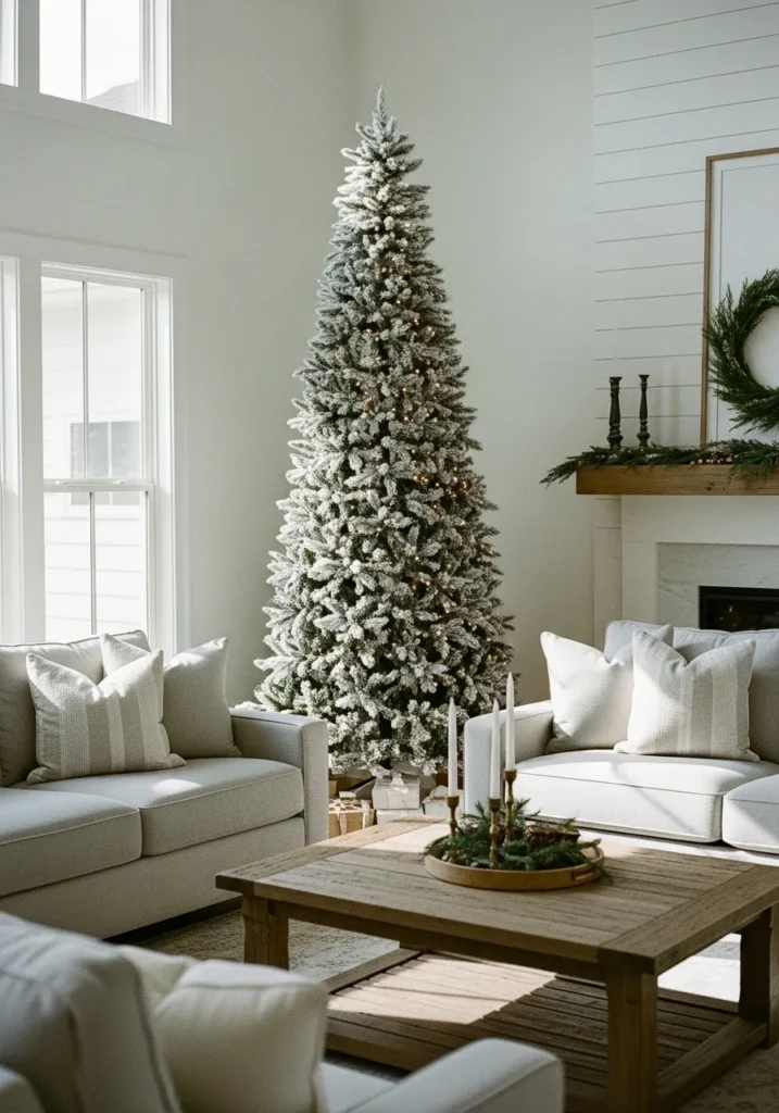 This living room captures the beauty of simplicity with a tall, flocked Christmas tree standing gracefully between two light sofas. The soft beige tones, natural wood coffee table, and minimalist greenery on the mantel create a peaceful, cozy setting. It feels bright and calm, yet still perfectly festive.