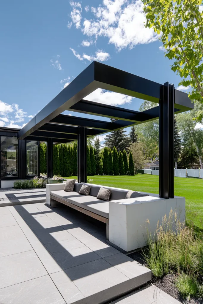 This outdoor space is a masterclass in modern minimalist design featuring an extremely sleek and bold aesthetic perfect for a contemporary home. The patio foundation uses large format gray pavers that flow right up to the built-in seating area creating a continuous streamlined look. Dominating the space is a massive cantilevered black metal pergola with a thick structural frame giving it a commanding almost sculptural presence. The clean lines of the black structure pop beautifully against the vibrant green lawn and the dark glass walls of the house for a seriously high-contrast moment.