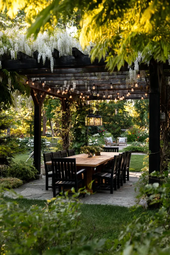 This picture captures the pure magic of an enchanted garden sanctuary perfect for those long summer nights of alfresco dining. A rustic wooden pergola painted a deep black creates a wonderful moody anchor for the entire dining area right on the lawn. The structure is softened by masses of beautiful white wisteria and lush green vines draping down to create a natural living roof overhead. Hanging bistro string lights and a cozy central lantern add that perfect romantic glow right over the big wooden farm table and coordinating black chairs.