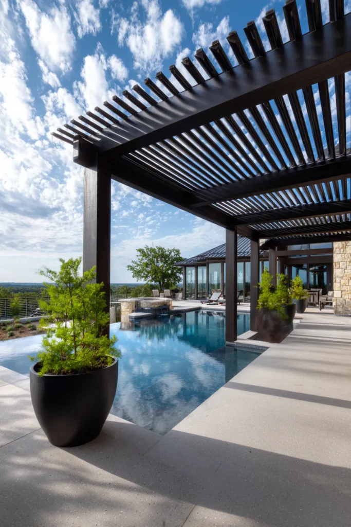 This sophisticated design features a stunning infinity pool that seems to spill right out into the gorgeous landscape below. The architecture is clean and contemporary using smooth paving stones and natural stone accents on the house structure creating a seamless transition from interior to exterior. Overhead a magnificent black louvered pergola provides structured shade and defines the whole outdoor living area giving it a serious upscale vibe. It’s truly an elevated space where every detail from the black planters to the seamless glass railings feels meticulously planned.