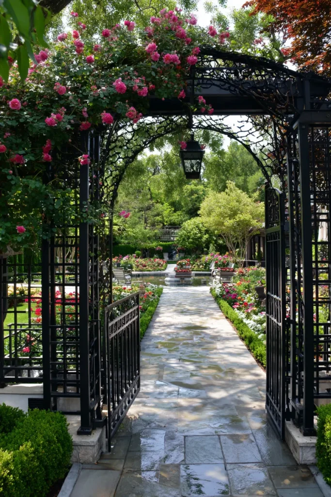 Imagine strolling into a secret garden and this is what greets you a breathtaking entrance framed by a beautiful black wrought iron pergola that acts as a gate and an arbor. It’s absolutely dripping with vibrant pink climbing roses creating such a romantic and whimsical atmosphere. The detailed scrollwork of the ironwork adds an old-world charm that feels both luxurious and inviting. A lovely stone path leads you further into a lush paradise where colorful flowerbeds and manicured greenery promise even more beauty to discover.