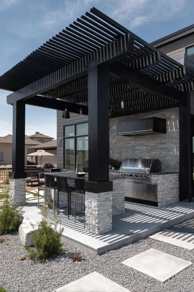 This amazing outdoor kitchen setup is the ultimate dream for anyone who loves to entertain especially on a sunny day. It features a robust black louvered pergola providing plenty of shade and a super stylish architectural statement over the whole area. The kitchen itself is built with gorgeous stacked gray stone combining functionality with a touch of natural texture while still looking incredibly sleek with its stainless steel appliances. A cool black countertop bar with modern stools makes it perfect for guests to gather and chat while the chef works their magic. It’s all about contemporary comfort and sophisticated outdoor living here.