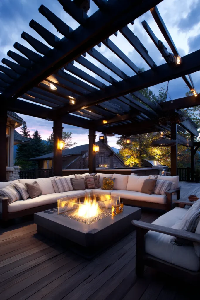 I am completely in love with this inviting setup because it just screams perfect evening vibes to me. The way the dark pergola frames the view and the warm lighting makes everything feel so incredibly intimate and cozy it’s like a big warm hug. I can totally imagine myself curled up on that comfy sofa with a good book or chatting with friends long into the night feeling utterly content and stylish. This space truly feels like a little slice of heaven right in your own backyard.