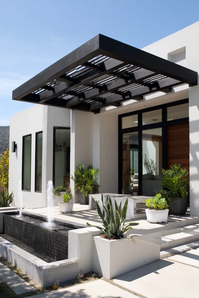This entrance is a stunning example of modern architectural drama where simplicity reigns supreme using a limited color palette. The exterior is composed of crisp white stucco walls and sharp black window frames creating that perfect high-contrast backdrop. The most striking element is the flat cantilevered black metal pergola that dramatically extends over the walkway and entrance casting graphic shadows onto the ground. A sleek multi-tiered water feature with dark tiling adds soothing sound and a layer of texture to this incredibly sophisticated front approach.