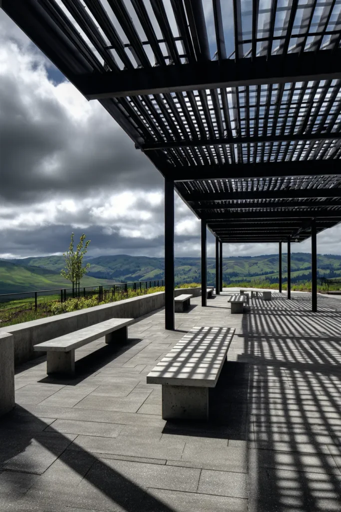 This incredibly dramatic and contemporary outdoor terrace is all about enjoying those breathtaking panoramic views and making a bold statement. It features a massive cantilevered black metal pergola with closely set louvered slats creating striking, graphic patterns of shadow across the wide patio below. The space uses simple, sharp materials like large format gray pavers and minimalist concrete benches that run along the low retaining wall, ensuring nothing distracts from the stunning rolling green hills beyond. It’s a structured, clean-lined design that elevates the feeling of being right on the edge of nature.