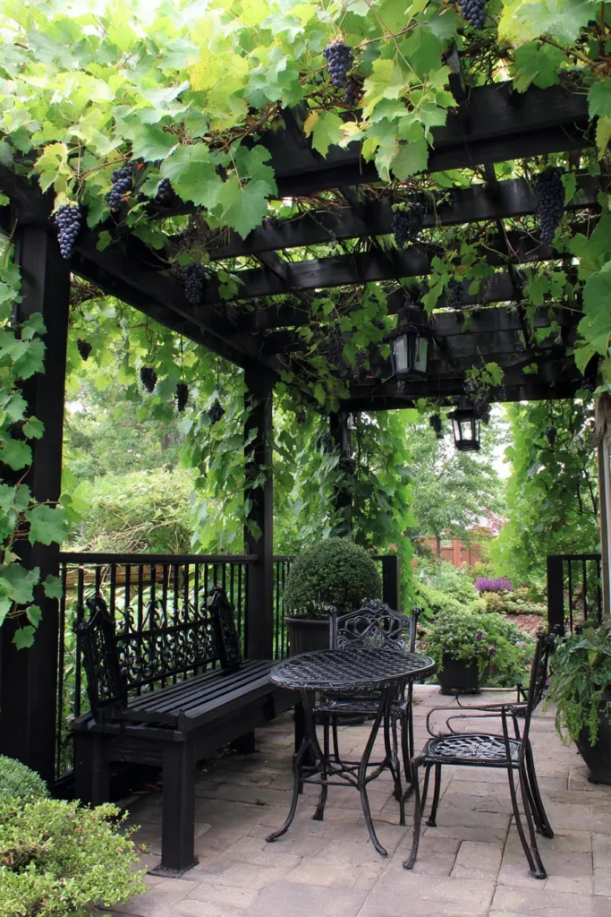 This picture is pure storybook charm creating a cozy, secluded retreat right in the middle of a lush backyard garden. The inviting space is covered by a sturdy wooden pergola stained a deep, rich black which makes the vibrant green foliage above really pop. Best of all the pergola is covered in grapevines with actual clusters of dark grapes hanging down which gives the whole area an incredibly unique vineyard feel. Underneath a set of dark wrought iron furniture and a classic black slatted bench provide the perfect spot for morning coffee or afternoon tea.