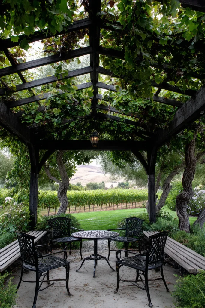This picture transports you straight to a lush vineyard in wine country creating a dreamy setting that is both intimate and open to the incredible scenery. A sturdy rustic black wooden pergola provides a beautiful natural roof covered with thick, winding grapevines and leaves that dapple the light. Beneath the canopy a classic wrought iron bistro set and matching dark wooden benches offer a lovely spot to sit and enjoy the moment. The structure perfectly frames the view of the meticulously lined grape rows and the rolling green hills stretching out beyond the lawn.