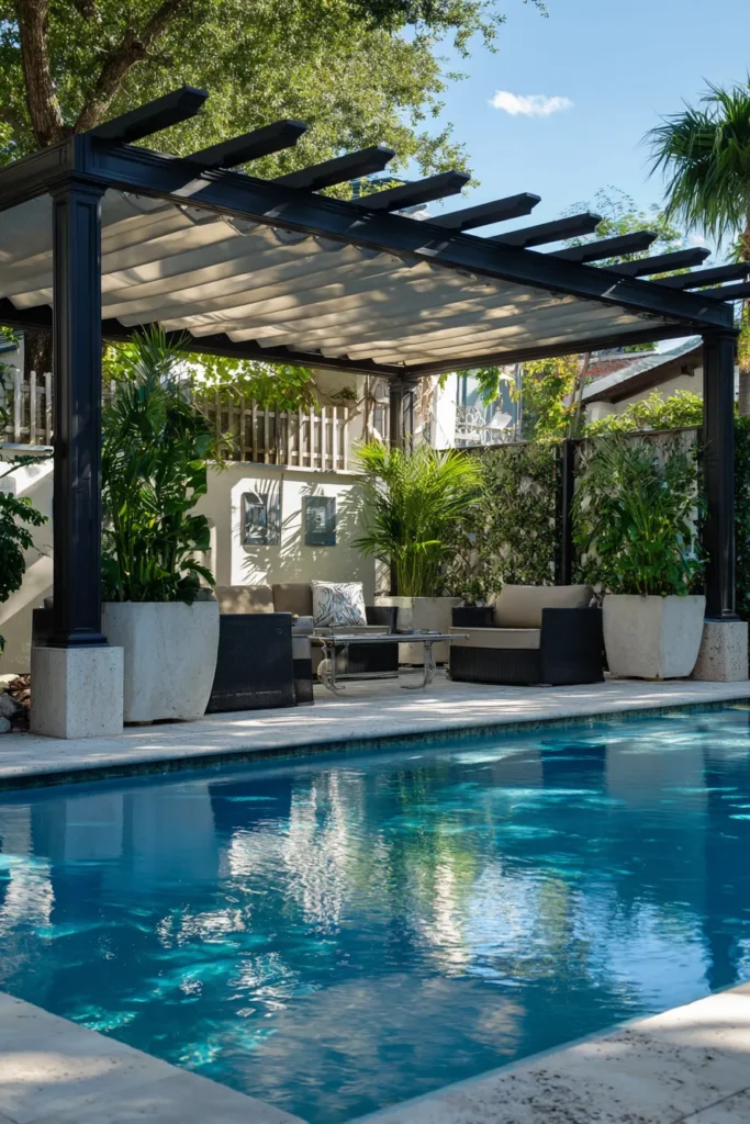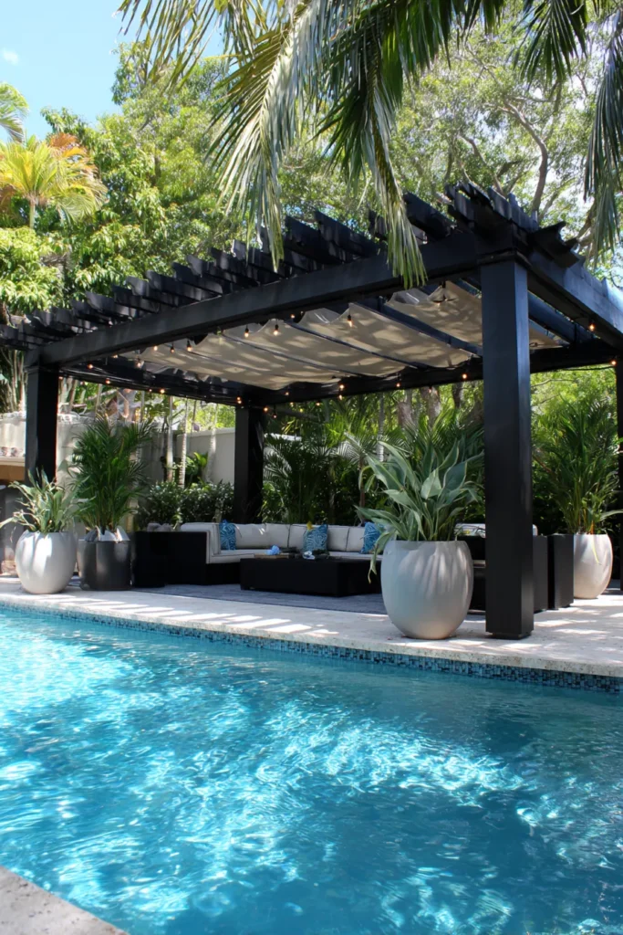 This luxurious setup is the ultimate definition of a tropical resort-style cabana creating a super chic and inviting poolside escape. The focal point is a large, substantial black wooden pergola with thick posts that provide a strong, dramatic contrast to the lush surrounding greenery and bright blue water. A retractable or fixed canvas canopy is installed underneath the slats to offer generous, comfortable shade. Plush, dark outdoor sectional seating is tucked underneath, surrounded by oversized white and gray planters holding beautiful tropical palms that instantly transport you to a vacation state of mind.