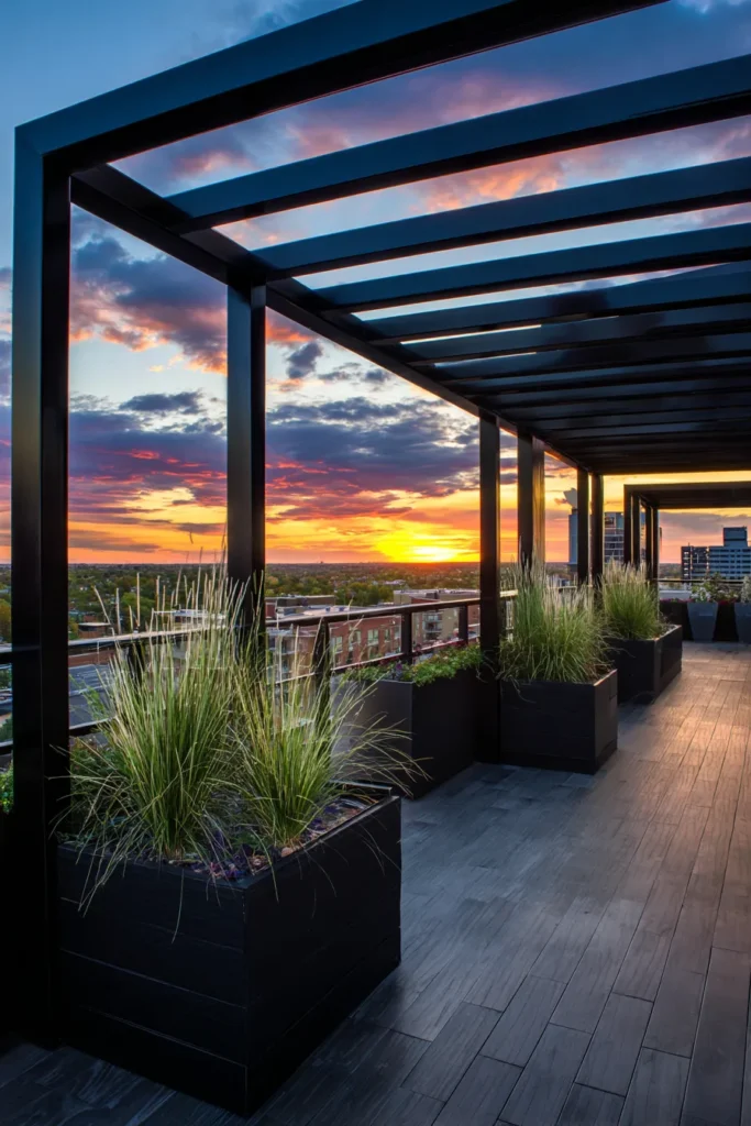 This incredible rooftop deck is the ultimate urban escape offering dramatic city views beautifully framed by the sunset and a super stylish structure. The area features a sleek, linear black metal pergola with widely spaced slats creating a striking architectural outline against the vibrant sky. The flooring is a dark composite decking which grounds the space beautifully while a row of tall grasses planted in matching black rectangular planters adds a touch of natural softness and privacy. This entire design is focused on clean lines and modern, high-contrast drama.