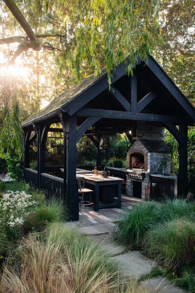 I absolutely adore the moody and sophisticated look of this black wood pavilion against the soft glow of the sun filtering through the surrounding trees. It feels like stepping into a little private European cottage and the stone oven is just the most charming feature ever. I can totally imagine spending cool evenings here making homemade pizza and feeling incredibly stylish and tucked away from the world. This design perfectly combines practicality with a cozy, romantic aesthetic that is truly unforgettable.