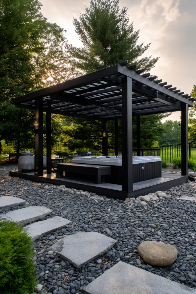 I absolutely love how this design turned a simple hot tub into such a high-end, stylish retreat because it feels so much more sophisticated than a regular setup. The sharp black pergola provides the perfect architectural contrast to the soft green trees and the gray river stones which is just so chic and calming. I can totally imagine soaking here after a long day feeling incredibly relaxed and completely tucked away from the world. This is truly an inspiring example of backyard luxury and modern design.