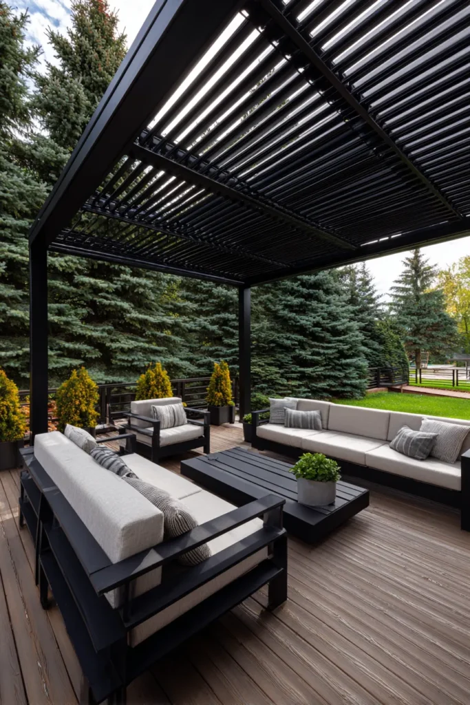 This outdoor lounge area is the epitome of modern sophistication creating a private, chic retreat right on a spacious wood deck. The showstopper here is the black louvered pergola which looks incredibly sleek and likely features adjustable slats for high-tech shade and light control. Underneath the canopy, the furniture matches the structure perfectly with clean-lined black frames and thick, light-colored cushions that look super inviting. Flanked by tall evergreen trees and small accent plantings this space feels incredibly secluded and serves up serious contemporary style goals.