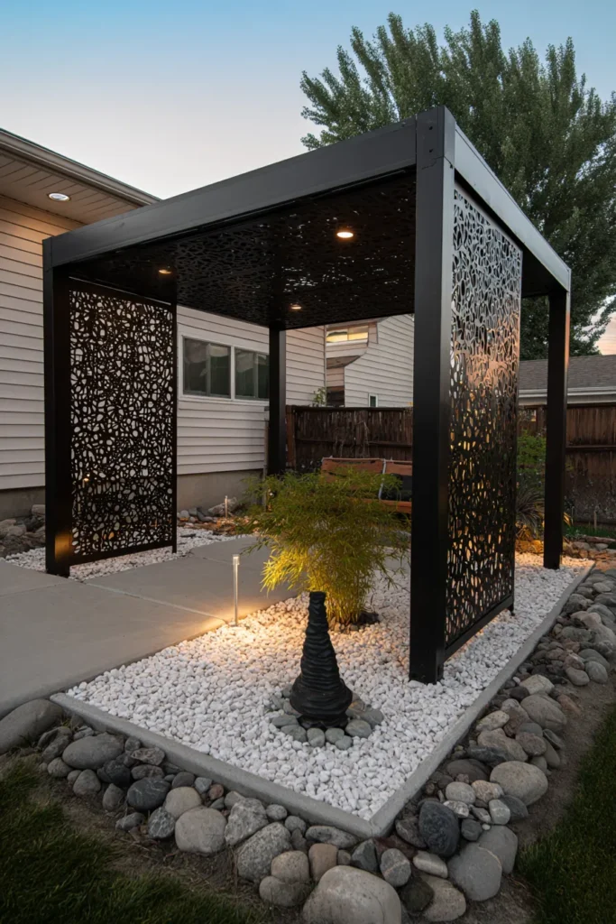 This small but mighty pergola is a fantastic example of using structure and art to create privacy right off the house. The simple, clean-lined black metal pergola frame is completely elevated by the incredible laser-cut decorative panels used on the sides which offer both visual interest and seclusion. Built-in downlighting highlights the beautiful patterned screens and the central bamboo plant and modern sculpture creating a stunning glowing feature at night. The whole structure sits perfectly on a bed of bright white pebbles and smooth river stones adding wonderful texture and a zen garden vibe.