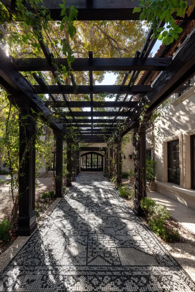 This magnificent design creates a grand, cloistered entry that feels like walking into a historic European estate full of secrets and romance. A long, dark black wooden pergola forms a stunning tunnel effect, its sturdy posts wrapped in lush green vines that filter the sunlight beautifully. The floor is the real showstopper here featuring an intricate black and white mosaic tile pattern that runs the entire length of the walkway adding incredible visual texture and drama. The combination of the dark wood and the detailed tile work against the light stucco walls is pure architectural perfection.