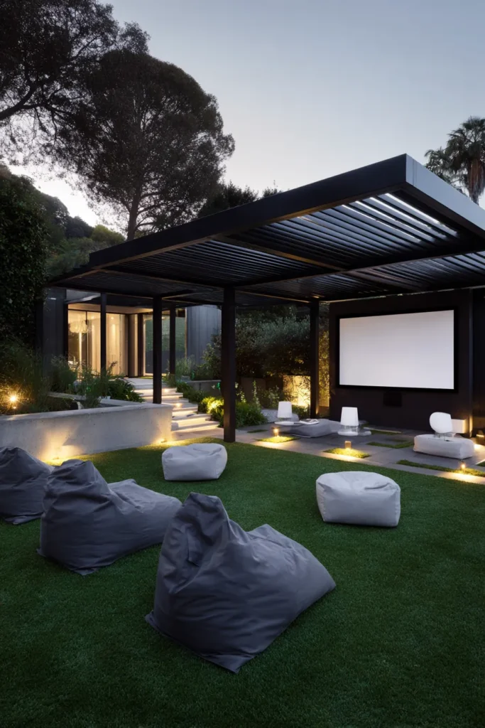 This is the ultimate backyard entertainment dream creating a chic, open-air movie theater right under the night sky. The stunning, ultra-modern structure is a sleek black metal louvered pergola providing defined shade and sophisticated architectural presence over the main patio area. The entire design is centered around the massive screen positioned perfectly for viewing from the plush, modern beanbag chairs scattered across the soft green lawn. Subtle landscape lighting and concrete retaining walls frame this incredible space, giving it a minimalist, high-end resort feel.