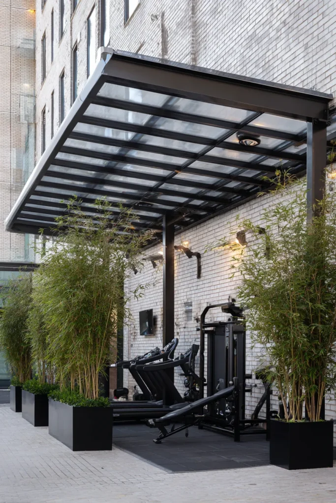 This ingenious design transforms a simple urban exterior into the chicest outdoor fitness area imaginable blending function with high-end style. A sleek, wall-mounted black metal pergola with a transparent, waterproof roof provides perfect shelter for the equipment making it a truly all-weather gym. The fitness area is anchored against a white painted brick wall and features modern black exercise equipment and rubber flooring for safety and comfort. Tall bamboo plants in streamlined black rectangular planters add a beautiful touch of privacy and greenery creating an incredibly fresh atmosphere.