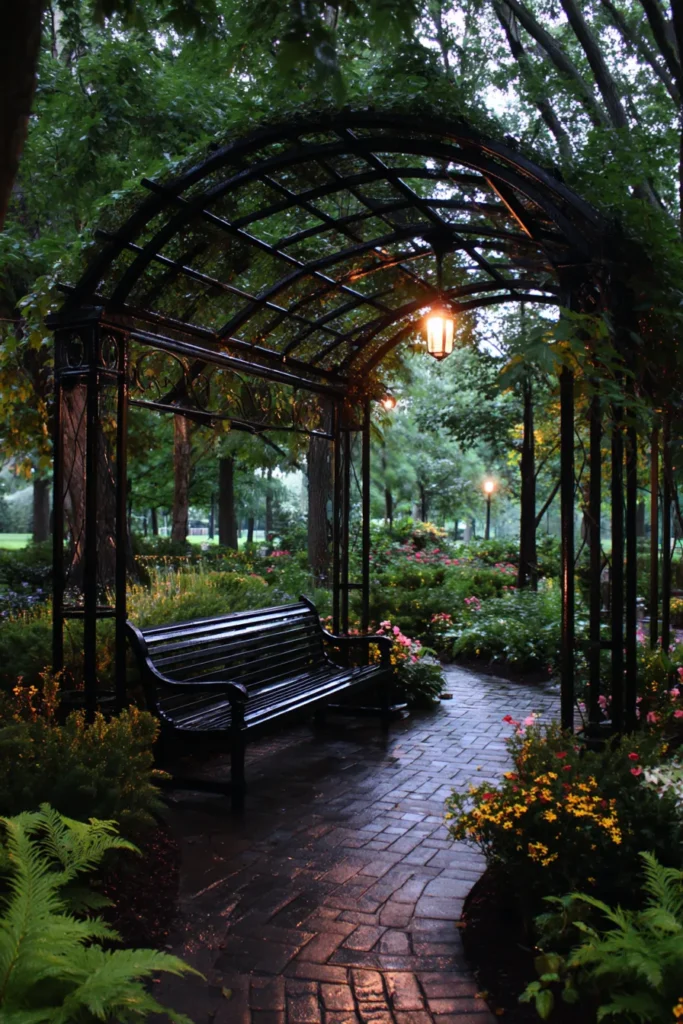 I honestly think this scene is the most magical thing I’ve ever seen because it feels like a secret spot pulled right out of a classic novel. I just adore how the dark, wet metal of the pergola and the bench makes the surrounding foliage and the warm lantern light feel so much more intense and dreamy. It has such a cozy, private atmosphere that makes me want to grab a blanket and sit and just listen to the rain and the sounds of the garden. This is a beautiful reminder that sometimes the simplest dark structure can create the most profound sense of romance and tranquility.