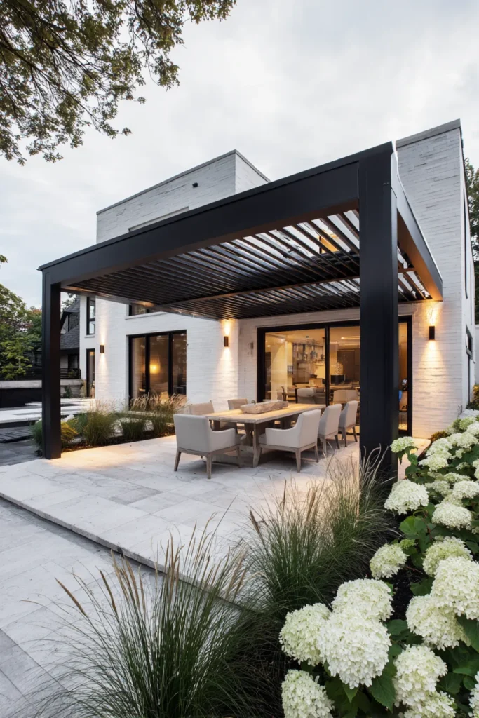 I honestly think this patio design is utterly flawless because the contrast of the bold black pergola against the bright white brick and stone is just jaw-droppingly gorgeous. I love how the lush, soft landscaping keeps the space from feeling too stark making it incredibly welcoming and chic at the same time. I can totally imagine hosting the most sophisticated evening gatherings right here with the subtle wall sconces glowing and feeling like I live inside a magazine. This design proves that sophisticated simplicity always creates the most lasting and beautiful impression.