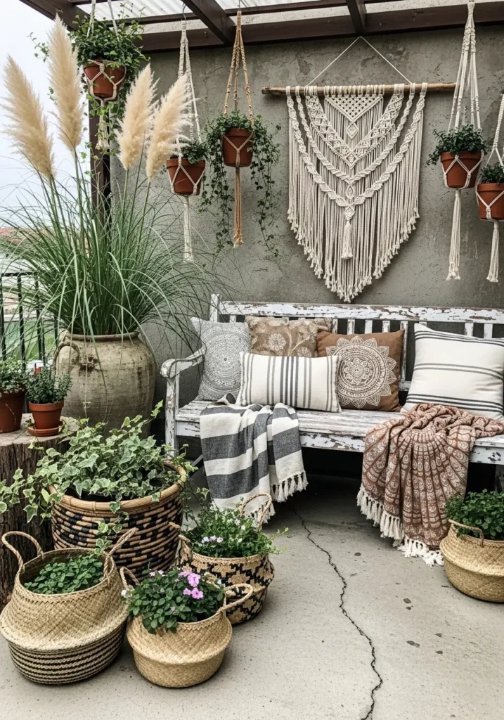 A textured macramé wall hanging becomes the star of this plant filled terrace corner. Woven baskets act as planters, and layered throws soften the built in bench. Pampas grass adds height and movement to the space.