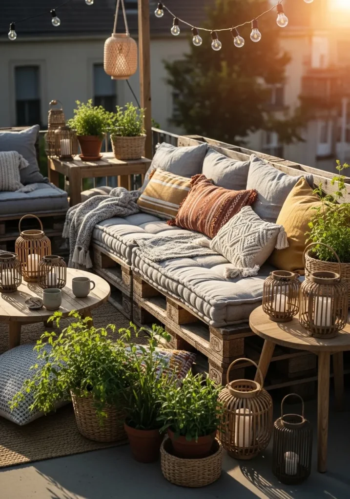 A low pallet sofa dressed in striped and patterned cushions stretches across the terrace. Potted plants cluster around the seating, and lanterns sit casually on the ground. The warm sunset light enhances the earthy palette beautifully.
