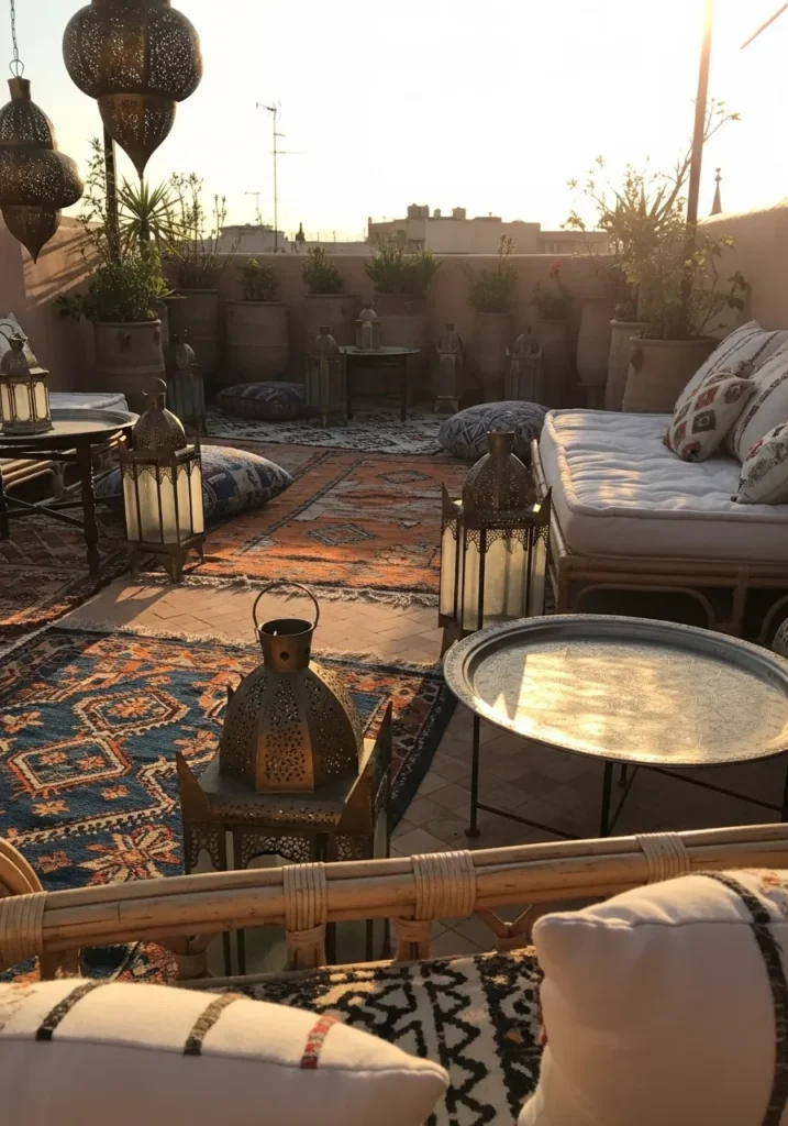 I honestly think this one steals the show. The combination of rugs, lanterns, and that glowing sky feels straight out of a dreamy Pinterest board. It is warm, inviting, and full of relaxed charm, which is exactly what a boho terrace should be.