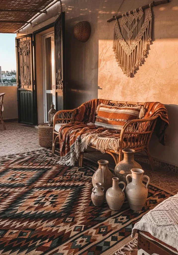 A patterned kilim rug stretches across the floor, paired with a striped throw draped over a simple sofa. Clay vases and pottery sit casually on the rug, adding earthy character and a touch of global inspiration. Warm sunset tones wash over the terrace, enhancing the rich reds and browns.