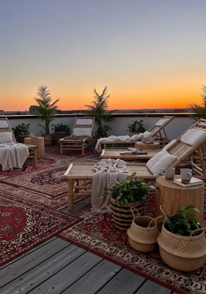 There is something magical about rugs layered on an open rooftop. I love how this design feels bold yet cozy at the same time. It instantly gives that relaxed boho energy that makes you want to stay out until the stars come out.