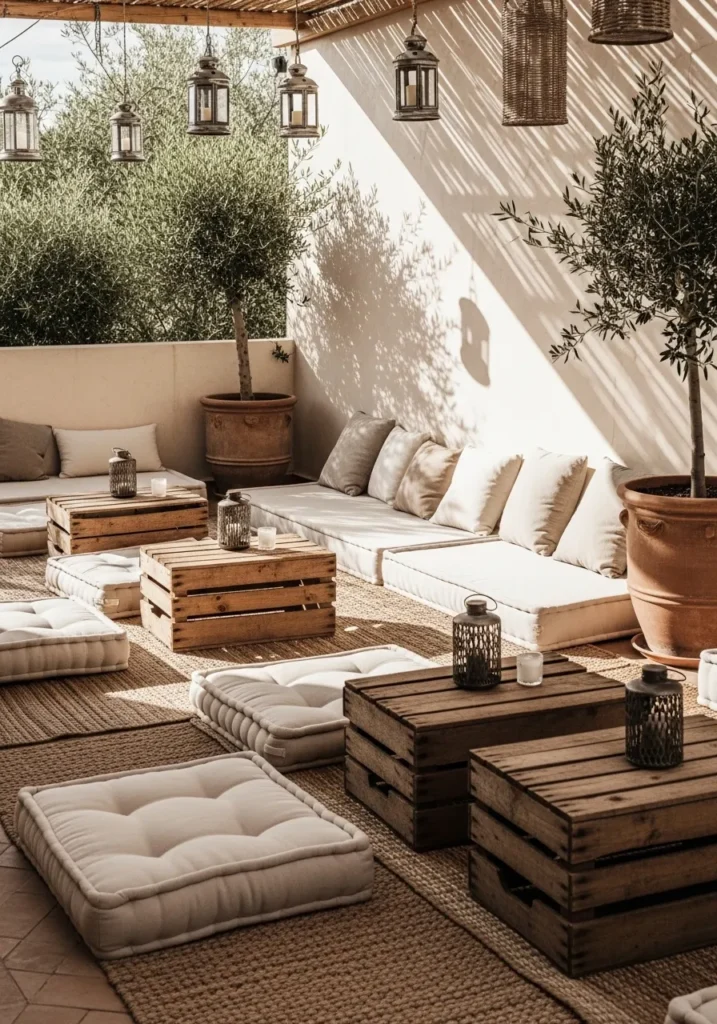 A low white sofa sits against a bright wall, styled with soft neutral cushions and surrounded by stacked wooden crates used as tables. Floor cushions rest casually on a woven rug, while olive trees and lanterns add organic texture. The space feels open, light, and effortlessly styled.